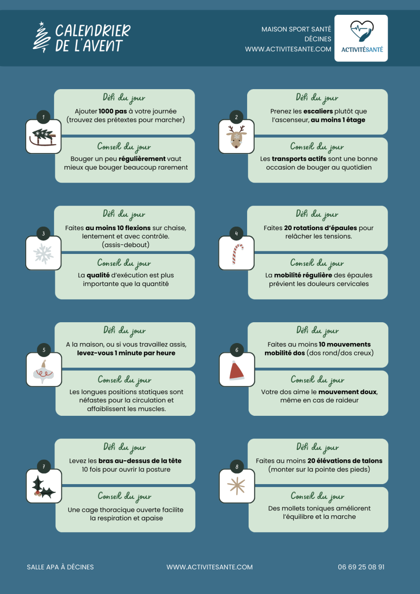 Comme chaque année, ACTIVITÉSANTÉ, salle Activité Physique Adaptée à Décines, vous propose son Calendrier de l’Avent dédié à l’activité physique et au bien-être.